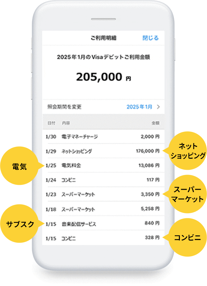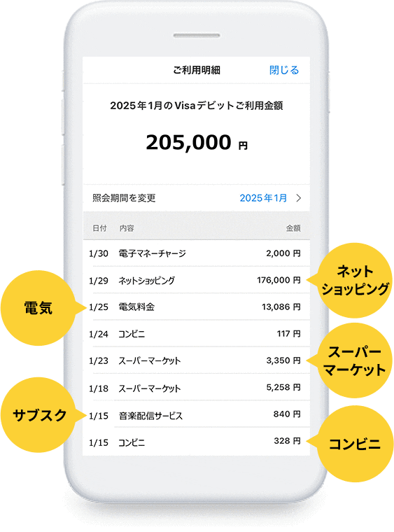 - 加盟店から送信される売上確定データに基づき集計は行われます。実際のVisaデビット利用日と売上確定データの利用日が異なる場合があります。例として月末にVisaデビットをご利用いただき、引落しが完了しても、売上確定データの利用日は翌月となることがあります。その場合は売上確定データの利用日に基づき、翌月の利用として計上されますので、月末近くのご利用の際にはご注意ください。