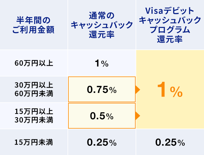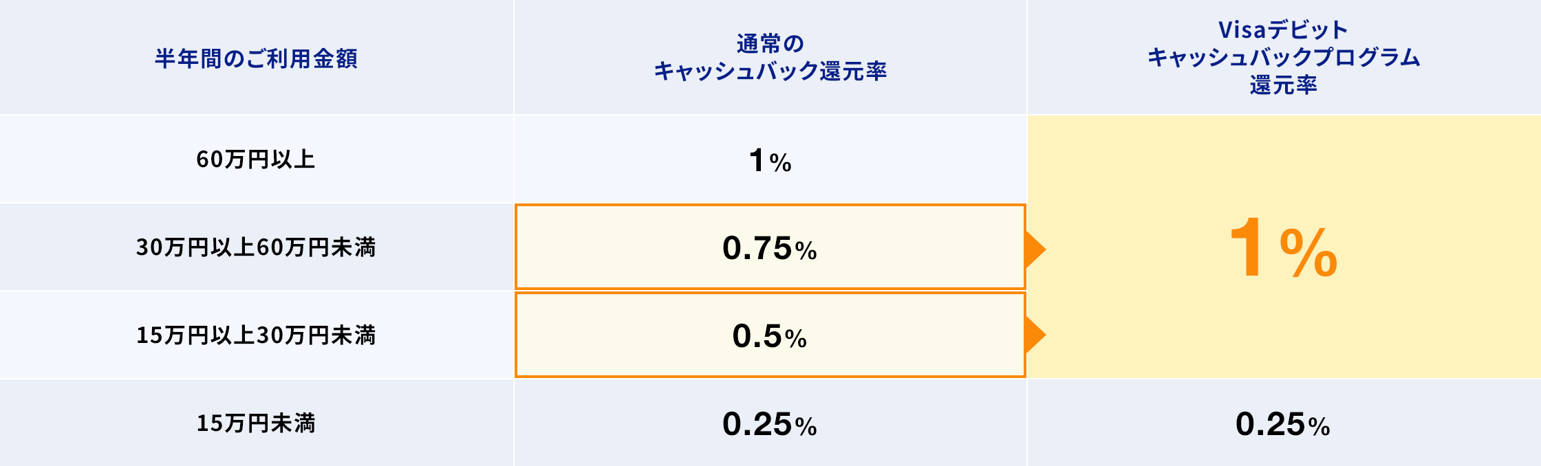 期間中のVisaデビットご利用金額に応じてキャッシュバック率を決定します。