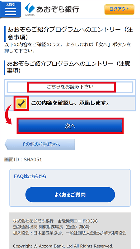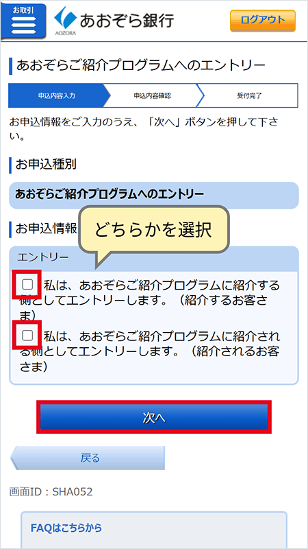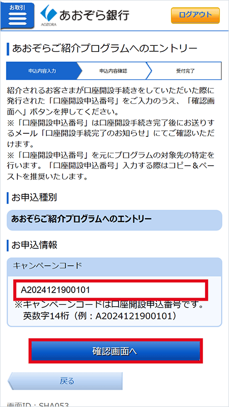 - ①2026年8月31日(月)までに、インターネットバンキングにて「紹介される方」の口座開設申込番号を入力しエントリーすること
