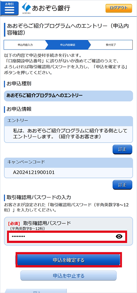 - ②2026年8月31日(月)までに、インターネットバンキングにてご自身(紹介される方)の口座開設申込番号を入力しエントリーすること