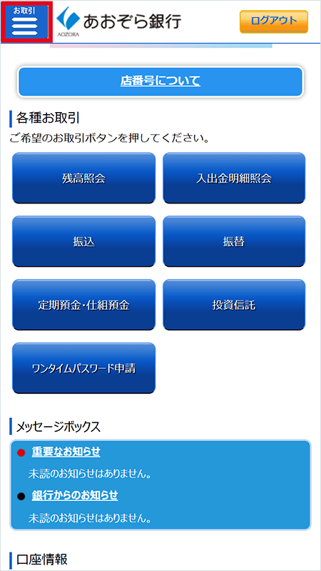 - ご本人さま以外のお取引内容(口座開設情報、残高等)についてのお問い合わせには、個人情報保護の関係上、あおぞら銀行からはお答えできかねますのであらかじめご了承ください。