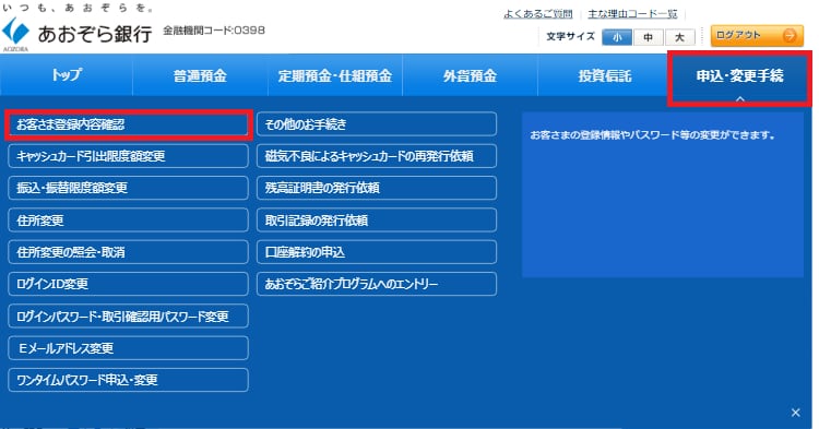 パソコンでインターネットバンキングにログインし、「申込・変更手続」の中の「お客さま登録内容確認」を選択。