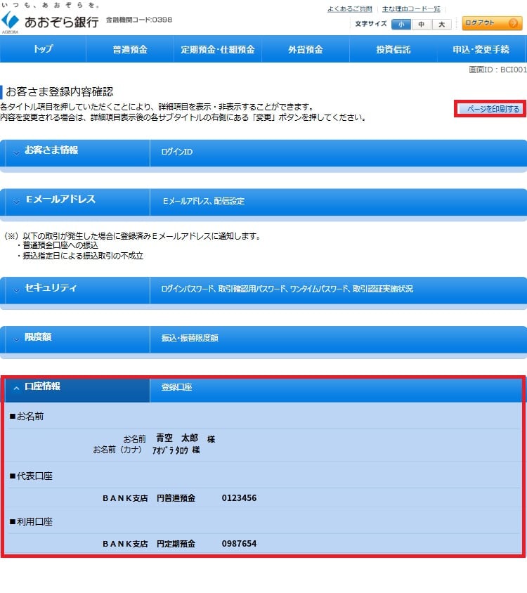 口座情報を表示させてページを印刷する。