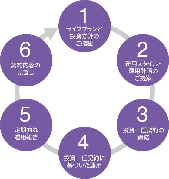 お客さまの投資方針のご確認、運用スタイル・運用計画のご提案、投資一任契約に基づいた運用の実行、定期的な運用報告等を通じた継続的なアフターフォロー・・・