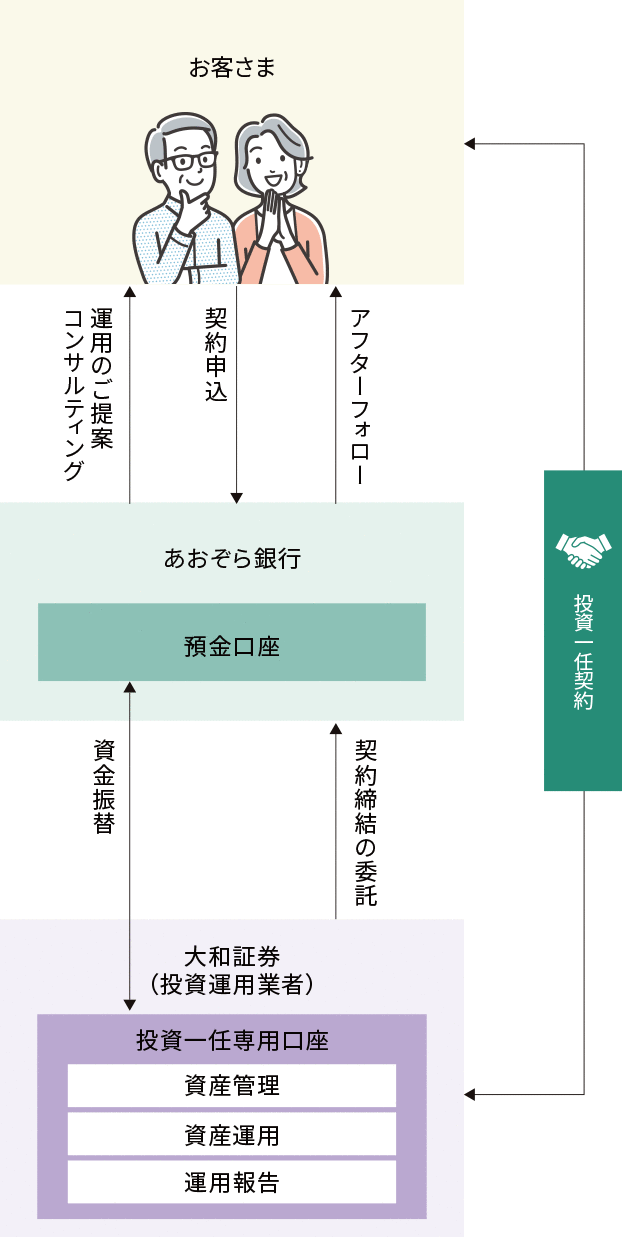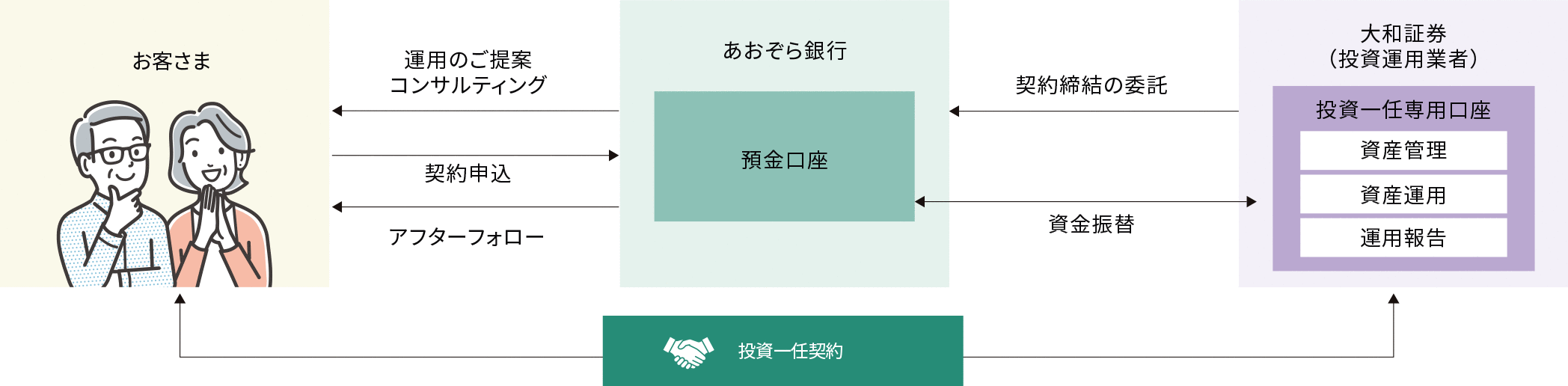 投資一任契約に基づき、お客さまからお預かりした資産の運用や口座管理は大和証券が行います。あおぞら銀行の店舗にて契約申し込みいただけます。