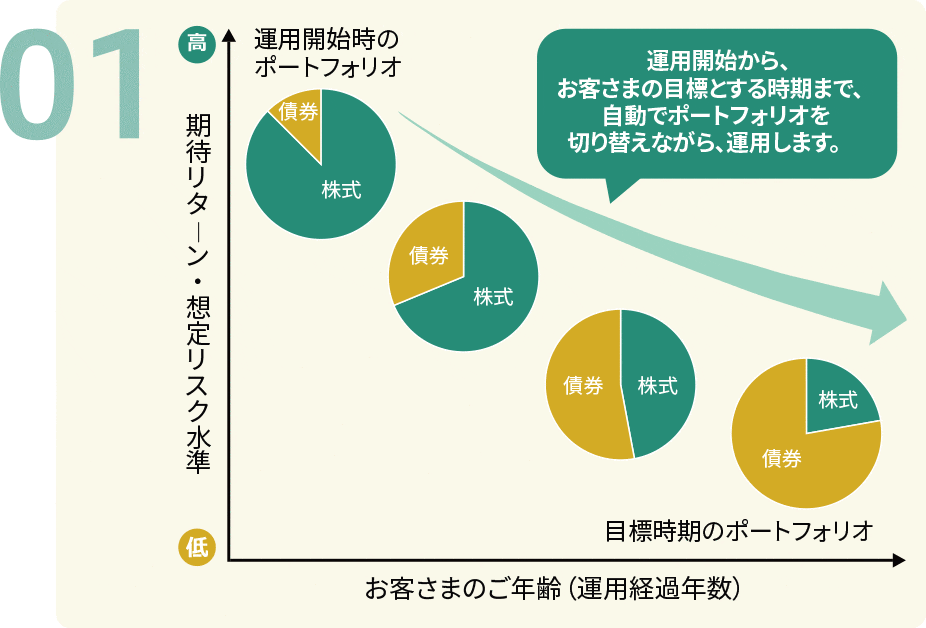 ポートフォリオを将来どのように切り替えるかの予定を、お客さま一人ひとりのライフプランや投資方針に基づき設定します。