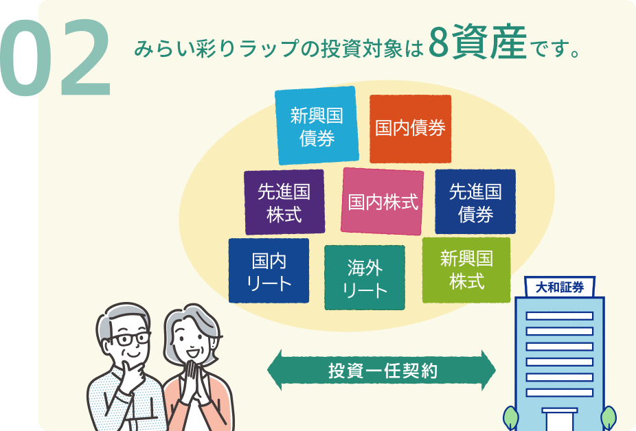 - 「みらい彩りラップ」は、大和証券が提供する投資一任運用サービスであり、契約の相手方は大和証券となります。あおぞら銀行は投資一任運用サービスを行ないません。