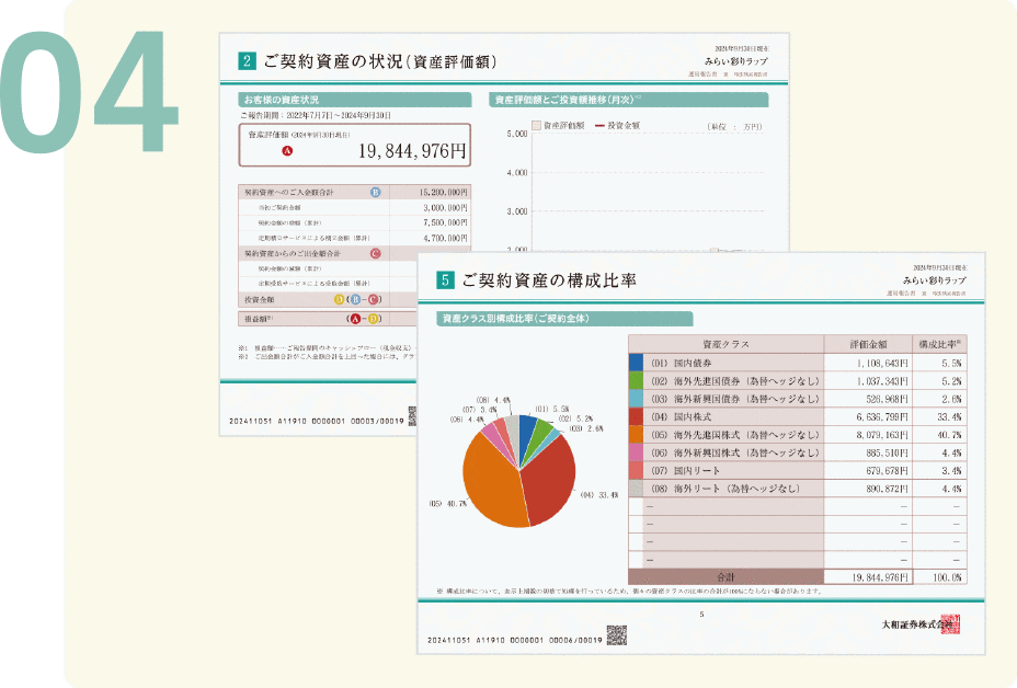 お客さまのご契約資産の状況や運用実績、お取引内容等を「運用報告書 兼 取引残高報告書」にて、定期的にご報告いたします。