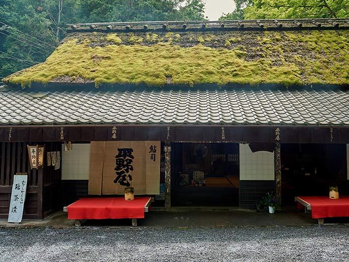 苔むした茅葺き屋根の建物は江戸時代の佇まいをそのまま残しています。黒光りする柱や建具、調度のひとつひとつに囲まれていると、まるでタイムスリップしたような心地に。