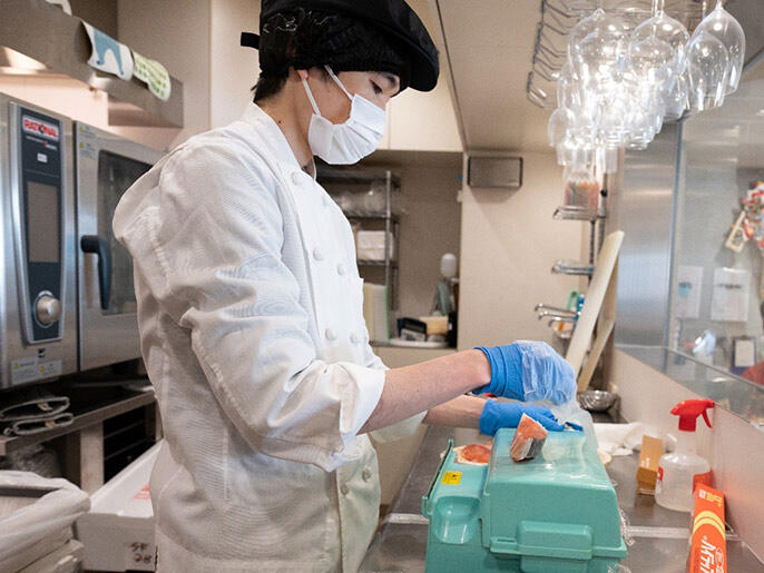レジカウンター後方にあるキッチンの作業を見せていただきました。ここで毎日加工しているので、新鮮な商品を提供できるのですね。
