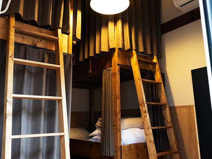 部屋のタイプは個室と、ドミトリーの2タイプ。宿泊者が自由に利用できる共有リビングにはキッチンも付いており、簡単な調理や食事もできます。