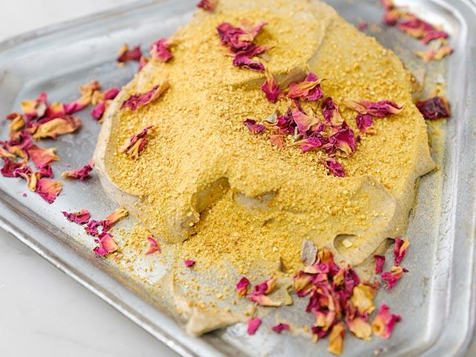 下の写真「ハーバルレアケーキ」は、ヘアカラーによる地肌への負担を軽減するトリートメント。自家製ハーブパウダーが、スクラブ効果でカラー剤の染料をキレイに除去してくれます。