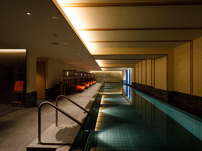 全長19mの宿泊者専用プールにも驚きました。奥の壁には平安絵巻を思わせる雲の絵が飾られているのも素敵です。