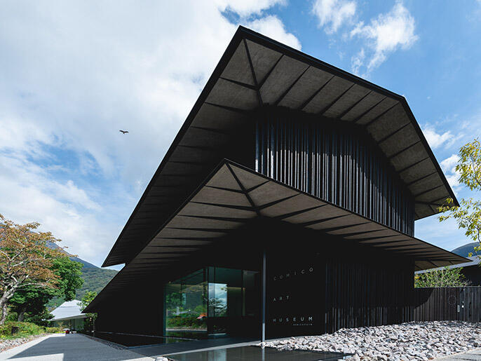 COMICO ART MUSEUM YUFUINは2017年の開業ですが、今年7月には新館をオープン。こちらも隈氏が設計を担当。本館と同様に黒い焼杉の外壁、傍らに水盤が敷かれていますが、新館は空に向かってシャープに伸びる屋根や外壁がユニークです。