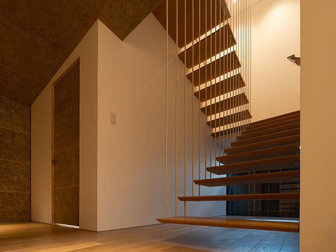 入ってすぐ目に飛び込んでくる吊り階段。踏板と吊り棒の描くラインがきれいです。隈氏の建築では美しく、かつ昇り降りしやすい階段の寸法を緻密に計算しているそうです。