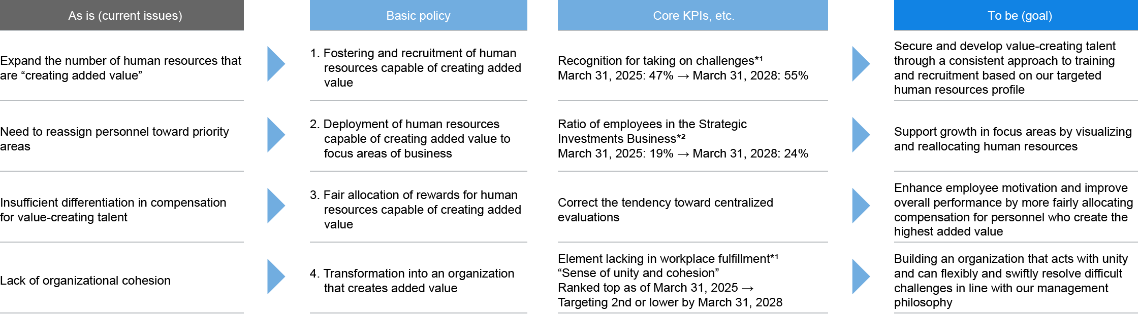 However, we recognize the following as key challenges to realizing our goal: the need to expand our pool of value-creating talent essential for executing our management strategy, the need to accelerate personnel reassignments to priority areas, such as the Strategic Investments Business, insufficient differentiation in compensation for top performing employees, and a lack of organizational cohesion. To address these issues, we have formulated four basic policies that set the direction for our human resources strategy. By continuing to invest in human capital in line with these four basic policies, regardless of changes in the economic environment, we will work to enhance the value of our human capital.