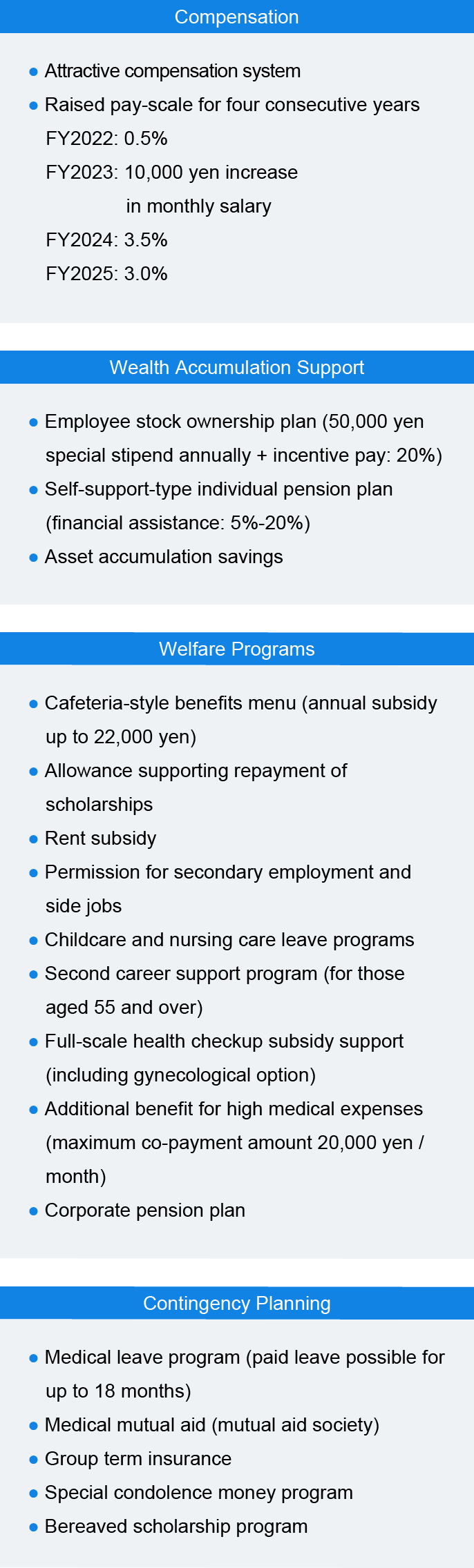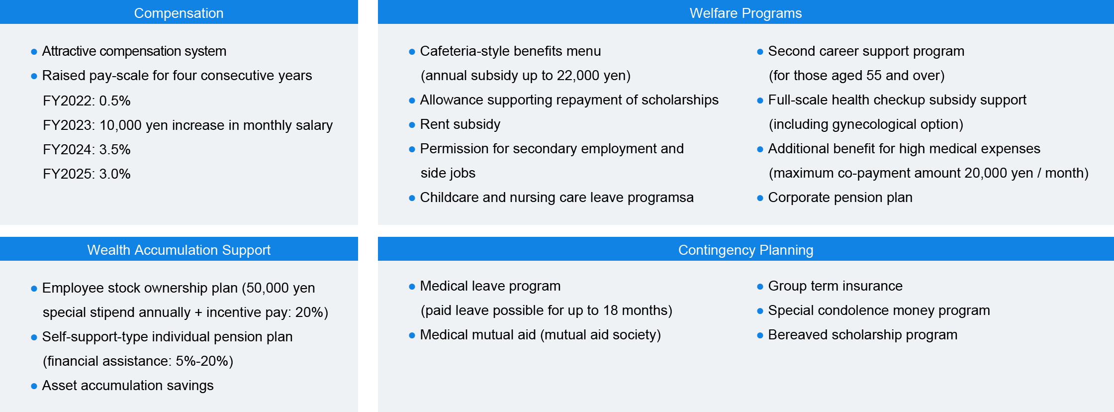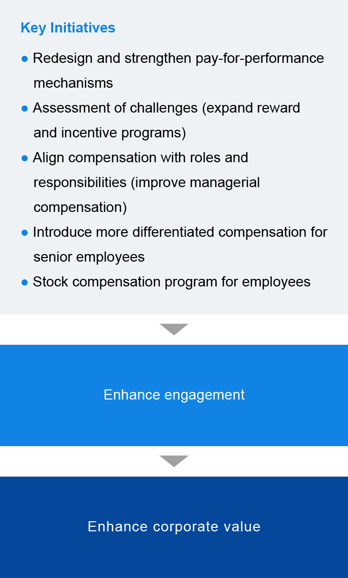 - Maintain a competitive compensation system (pay-scale increases implemented for four consecutive years), introduce a stock compensation program for employees