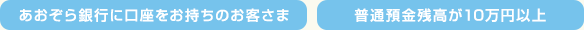 実施期間中、ご紹介を受けたお客さま(ご家族・ご友人など)があおぞら銀行の店舗(窓口)にご来店のうえ、口座開設いただき、対象商品(下記の金額以上)※をお取引していただきますと、お一人さまのご紹介につき、ご紹介者さまとご紹介を受けたお客さまにそれぞれ3,000円の商品券をプレゼントいたします。