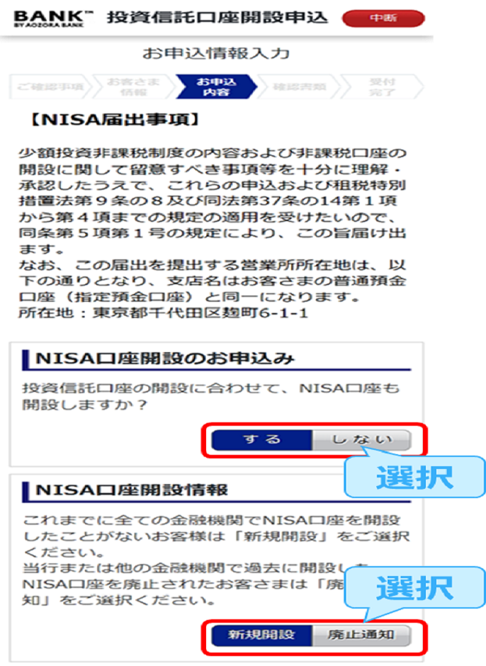 ②プルダウンから「あおぞら銀行 投資信託口座・NISA口座開設」を選択