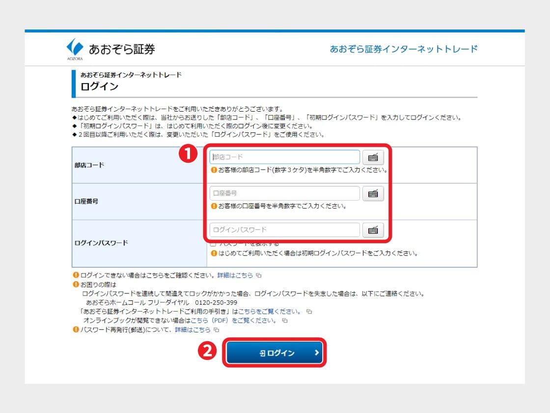 ②部店コード/口座番号/ログインパスワードを入力して「ログイン」ボタンを押してください。