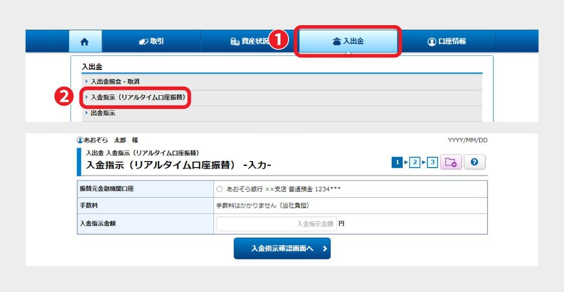 リアルタイム口座振替を契約されているお客様は、あおぞら銀行の口座のお預かり金を即時にインターネットトレードの口座へご入金いただけます(平日の7:30から21:00まで可能です)。