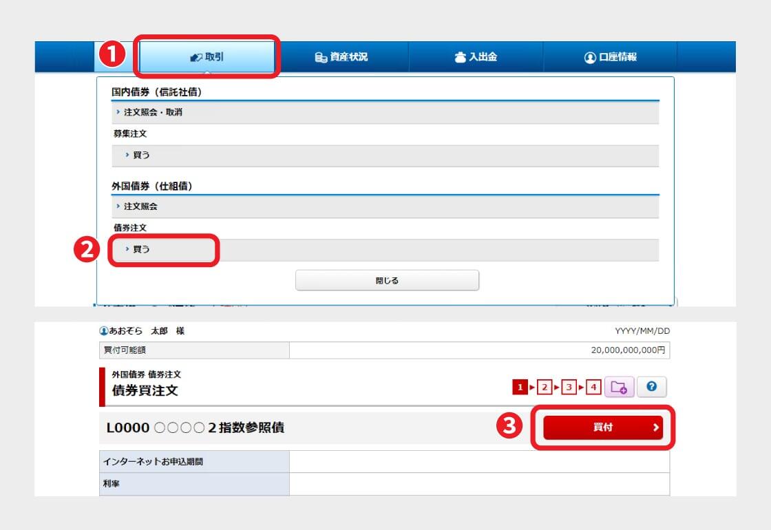 ②サブメニュー「外国債券(仕組債)」⇒「債券注文」⇒「買う」を選択してください。