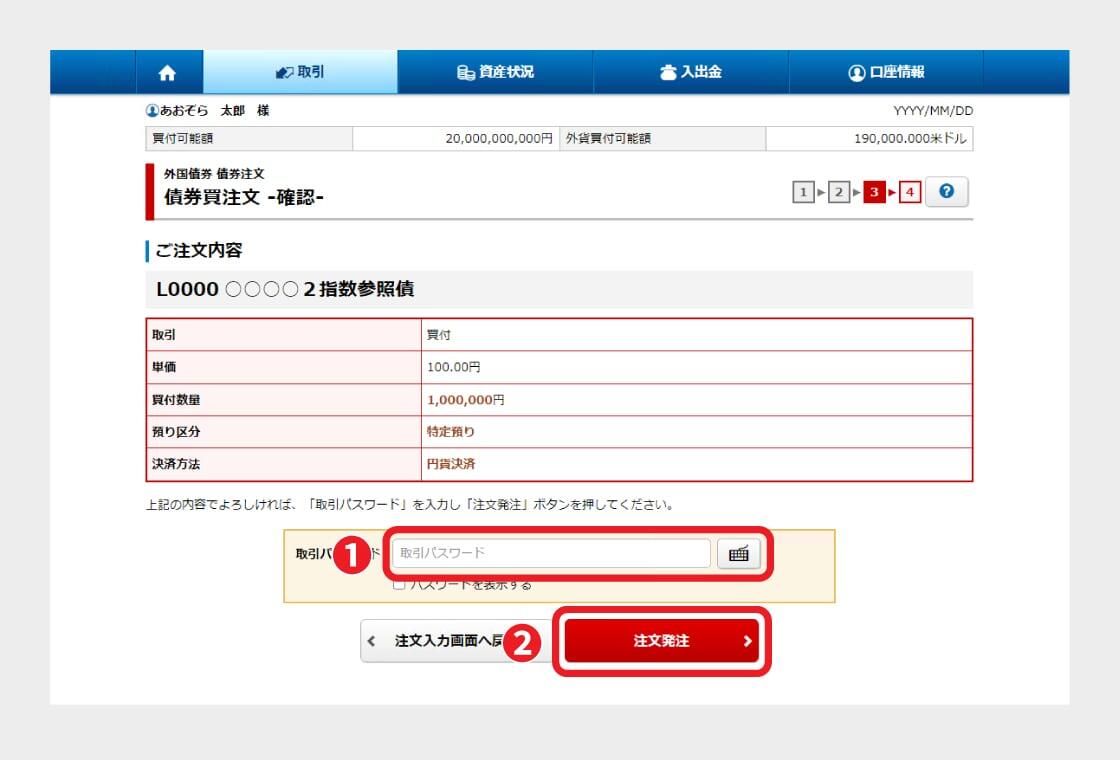 ①注文内容を確認し、「取引パスワード」を入力してください。