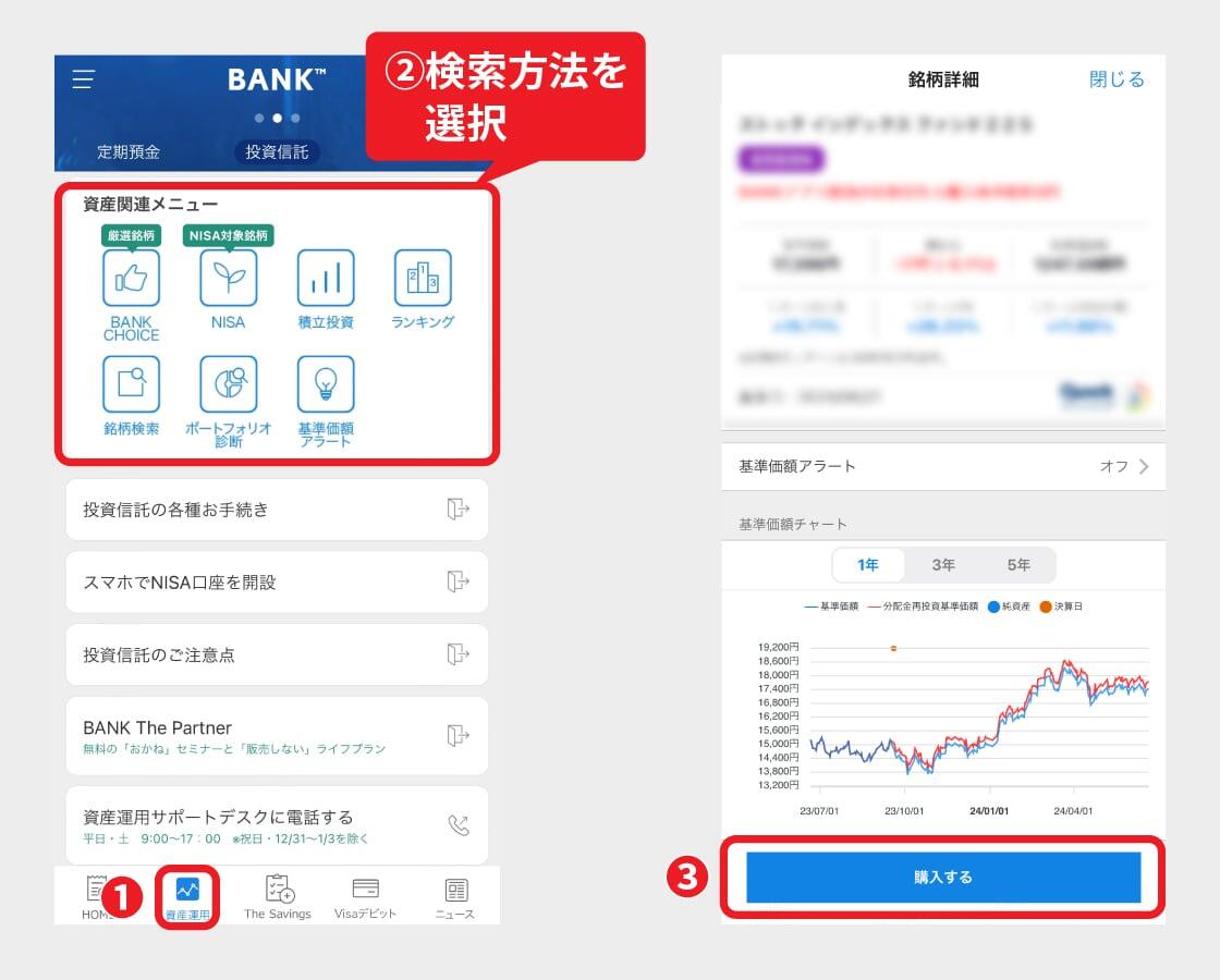 ①BANKアプリの「資産運用」を選択②「資産運用メニュー」から検索方法を一つ選択