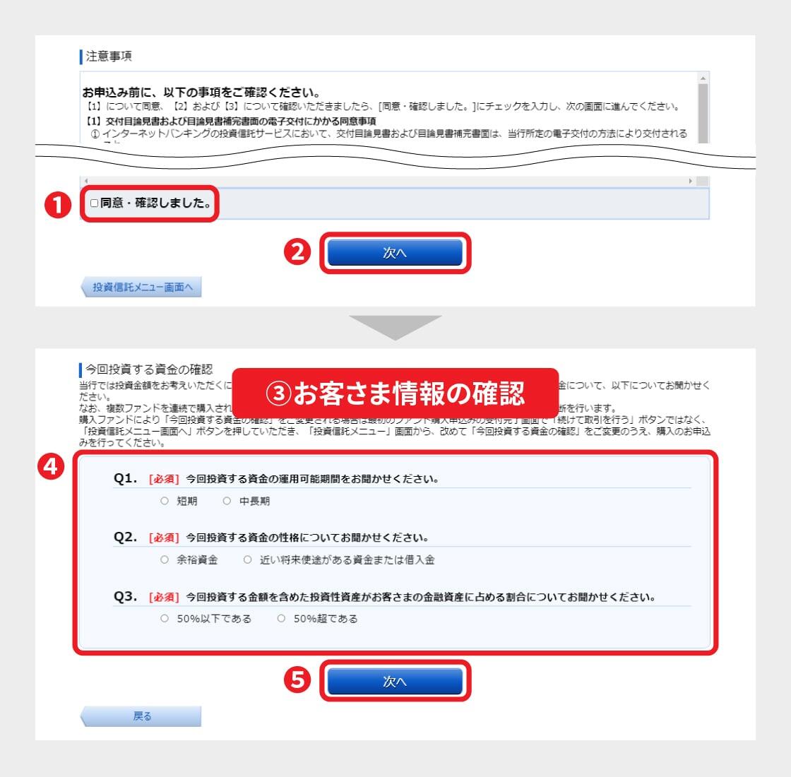 ※既にお客さま情報を登録済みの方は内容に変更がないか確認する画面が表示されます④今回投資する資金の確認