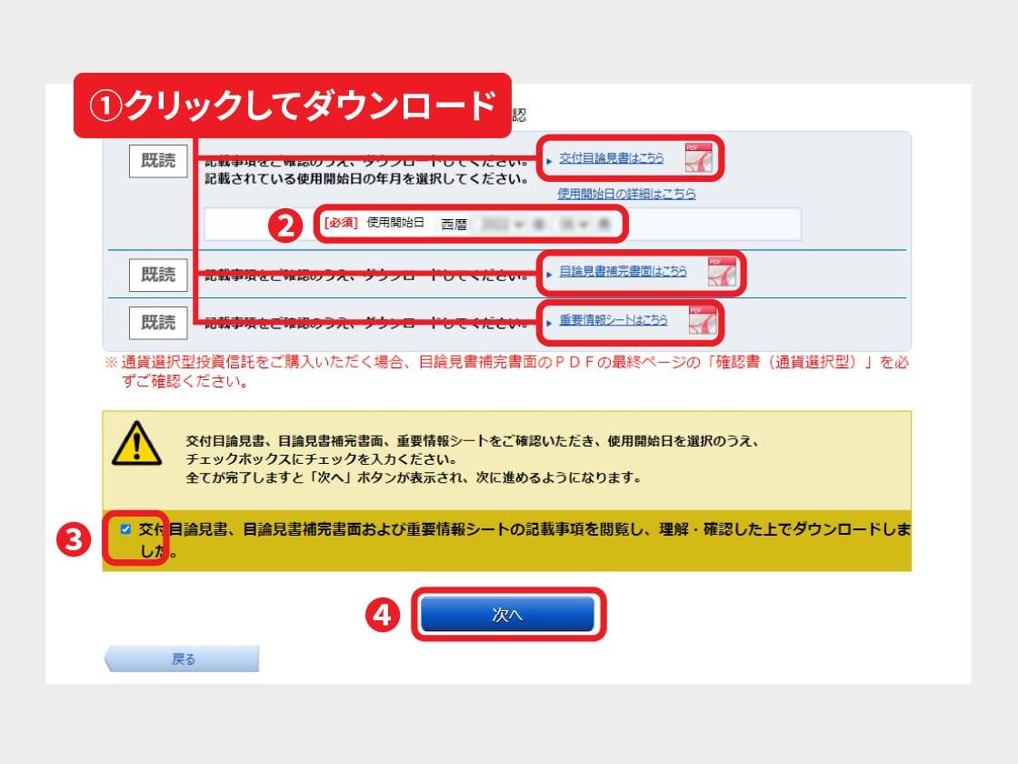 ①「交付目論見書」「目論見書補完書面」「重要情報シート」をダウンロードし、内容を確認