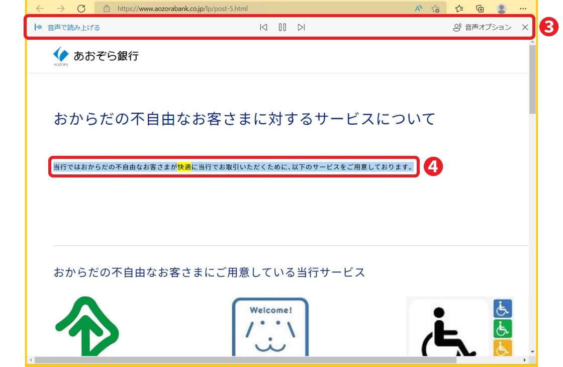 ④読み上げ対象の行が青色、読み上げているテキストが黄色のハイライトで表示されます。